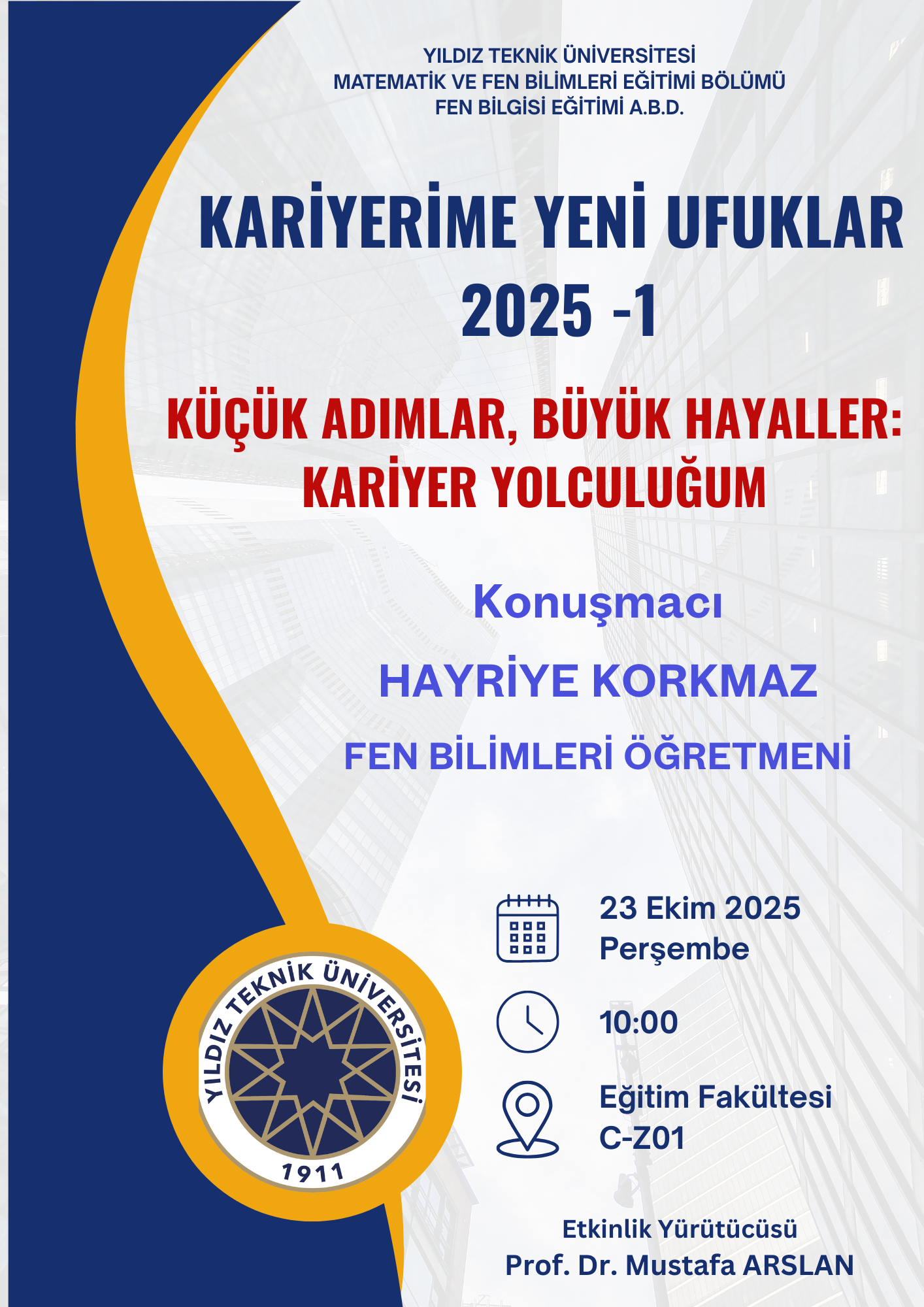 23 Ekim 2025 Perşembe günü, Fen Bilgisi Öğretmenliği anabilim dalımızın düzenlediği Kariyerime Yeni Ufuklar etkinlikleri kapsamında 2025 yılının ilk etkinliği Küçük Adımlar, Büyük Hayaller: Kariyer Yolculuğum semineri yapılacaktır. Saat 10:00’de fakültemiz CZ-01 adlı salonda gerçekleşecektir.