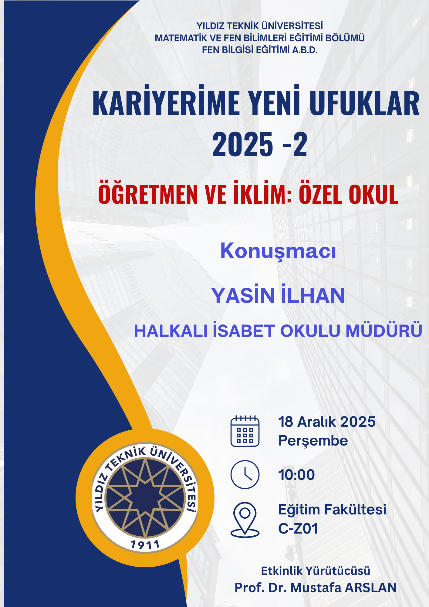 18 Aralık 2025 Perşembe günü, Fen Bilgisi Öğretmenliği anabilim dalımızın düzenlediği Kariyerime Yeni Ufuklar etkinlikleri kapsamında 2025 yılının ikinci etkinliği Öğretmen ve İklim: Özel Okul semineri yapılacaktır. Saat 10:00’de fakültemiz CZ-01 adlı salonda gerçekleşecektir.