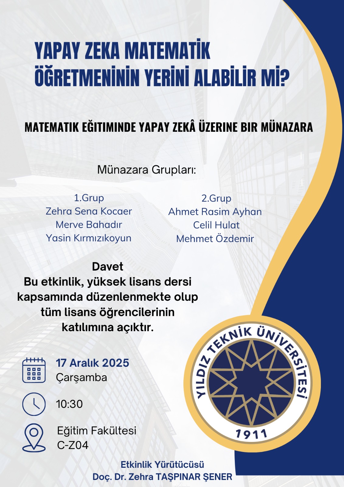 17 Aralık Çarşamba günü, ''Yapay Zeka Matematik Öğretmeninin Yerini Alabilir Mi?'' etkinliği kapsamında lisansüstü öğrencilerle matematik eğitiminde yapay zeka kullanımı üzerine bir münazara gerçekleştirilecektir. Etkinlik tüm öğrencilerin katılımına açıktır. Katılımlarınız rica olunur.