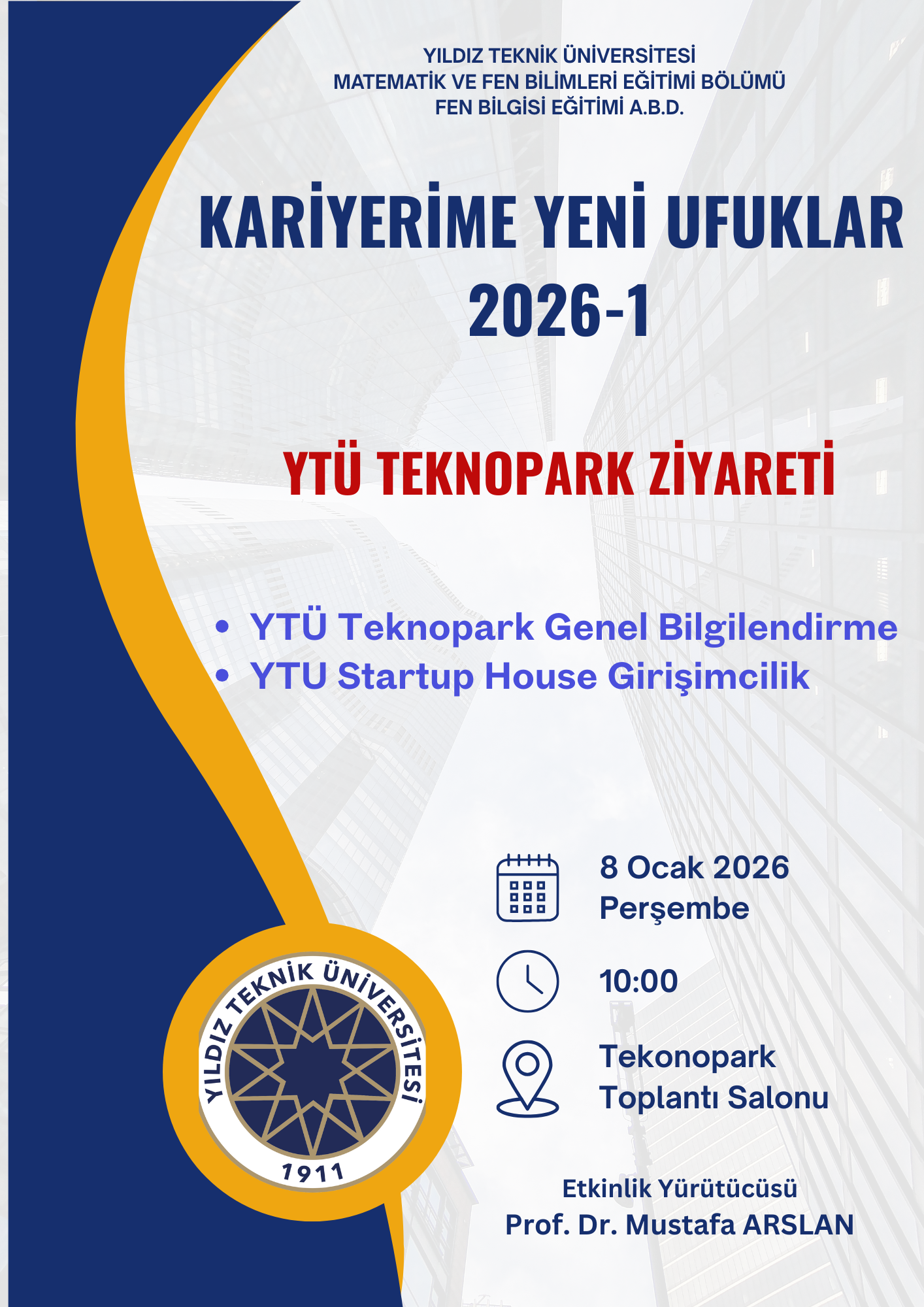 8 Ocak Perşembe günü, Fen Bilgisi Öğretmenliği anabilim dalımızın düzenlediği Kariyerime Yeni Ufuklar etkinlikleri kapsamında YTÜ Teknopark Ziyareti yapılacaktır. Saat 10:00’da YTÜ Teknopark Toplantı Salonu'nda gerçekleşecektir.
